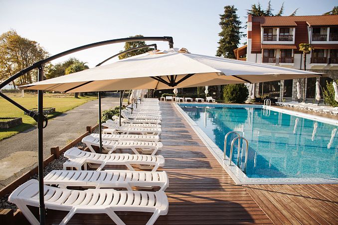 Собственный песчано-галечный пляж 50м, 3-разовое питание по системе "шведский стол", открытый подогреваемый бассейн.