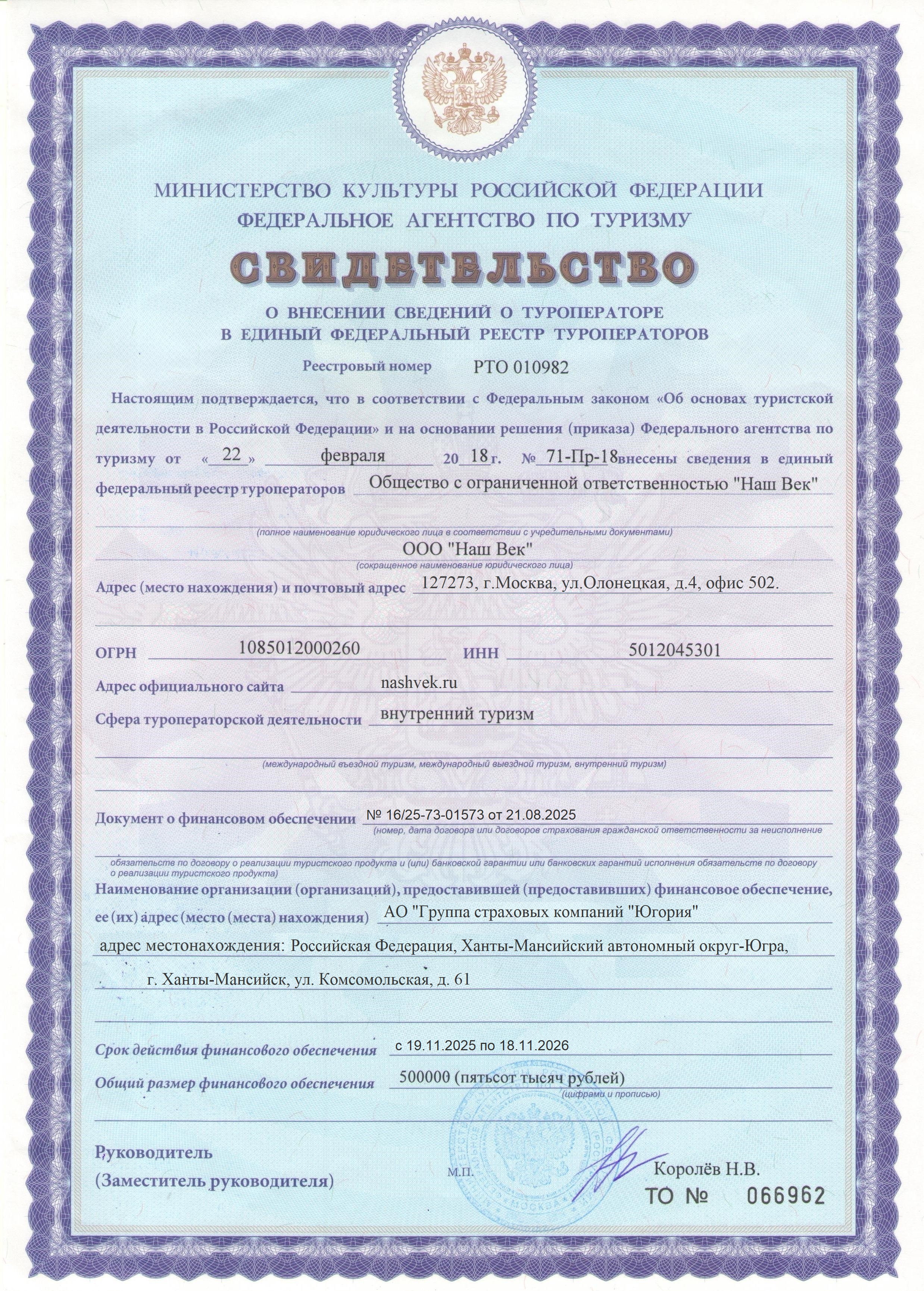 NashVek.ru (ООО "Наш Век" ИНН 5012045301) включен в реестр туроператоров Федерального агентства по туризму (Ростуризм) под номером РТО 010982.