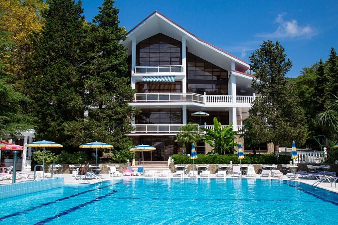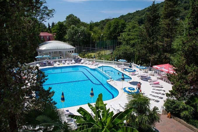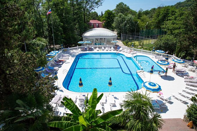 Санаторий "Октябрьский"Санаторий Центр Сочи, СочиСобственный галечный пляж, питание по системе "шведский стол", крытый и открытый бассейн, аквапарк, зоопарк, детская комната