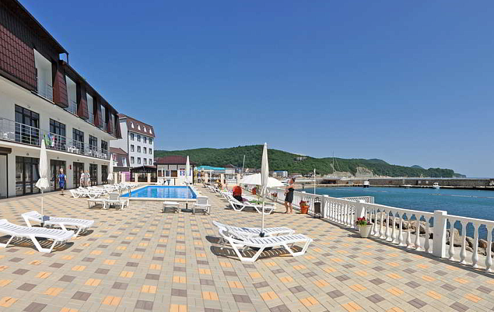 Пансионат "Приветливый берег"Пансионат Центр Геленджика, ГеленджикСобственный мелкогалечный пляж в 50м, питание "шведский стол", открытый подогреваемый бассейн, детский клуб