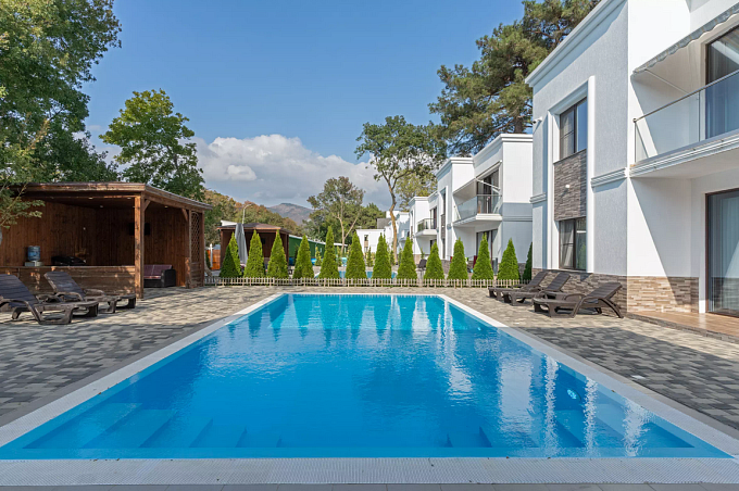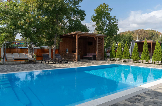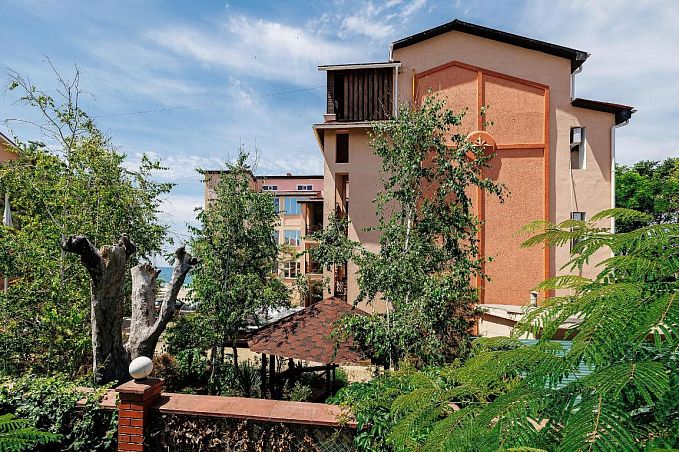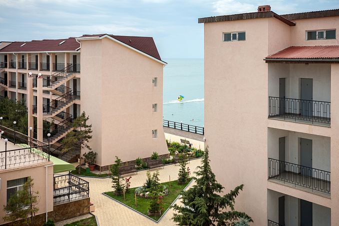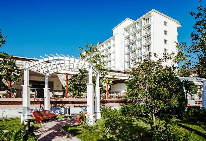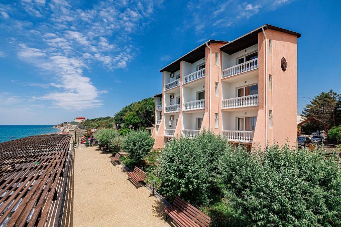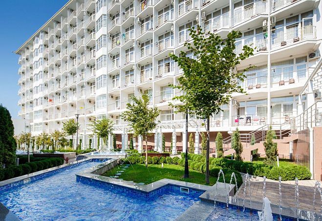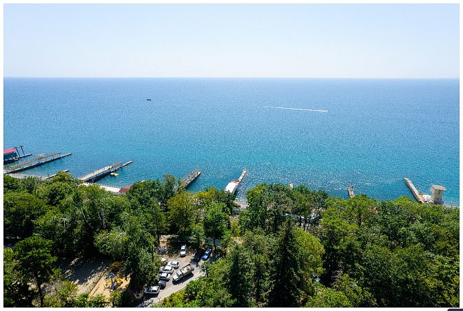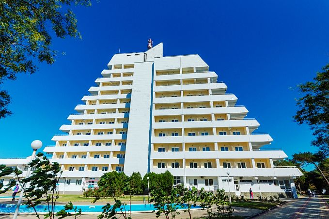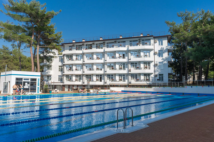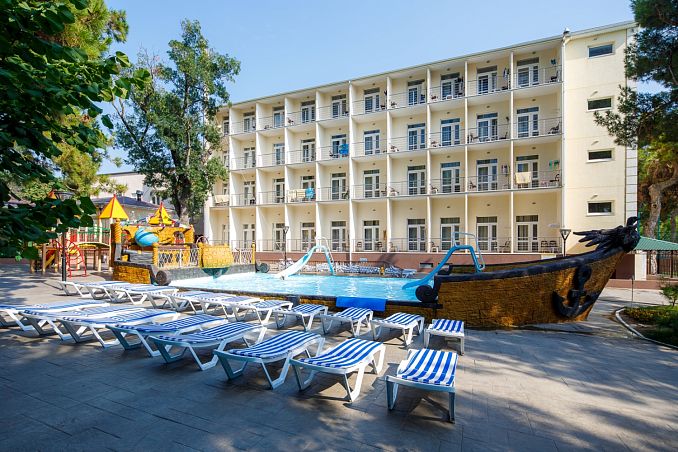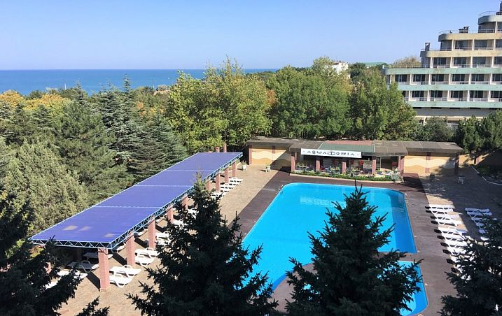 Собственный мелкогалечный пляж в 100м, питание "шведский стол", открытый бассейн, бювет с минеральной водой, детская комната, Wi-Fi и парковка